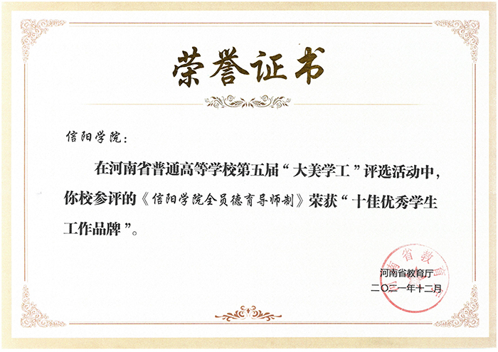 颁奖典礼上,我校共斩获4项奖项:荣获2020年河南省“大美学工”十佳优秀学生工作先进单位,“信阳学院全员德育导师制”项目荣获2021年河南省“大美学工”十佳优秀学生工作品牌称号,“全员德育导师制”荣获2020年河南省学生工作优秀成果二等奖,“‘六位一体’资助育人工程”荣获2021年河南省学生工作优秀成果二等奖。褚金海代表学校上台领奖。