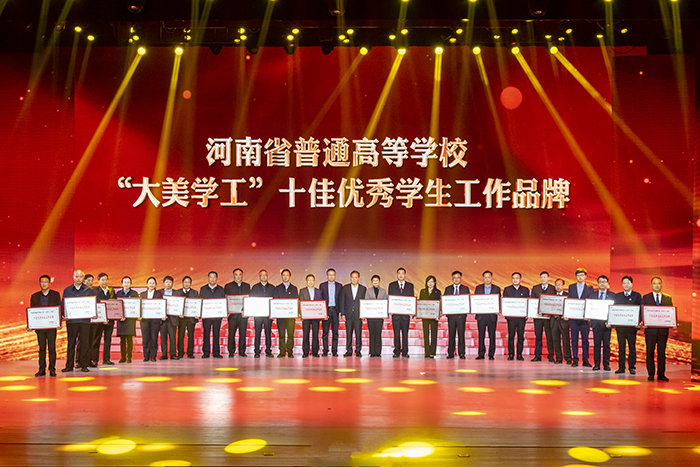 4月3日,由中共河南省委高校工委、河南省教育厅主办的河南省普通高等学校“大美学工”颁奖典礼暨学生工作优秀成果展演在洛阳师范学院举行,为2020年、2021年全省普通高等学校“大美学工”十佳学生工作先进单位、十佳学生工作优秀品牌、学生工作先进个人、学生工作优秀成果颁奖。省委常委、洛阳市委书记江凌,省委教育工委副书记、省教育厅党组书记、省教育厅厅长毛杰等领导出席颁奖典礼。我校党委书记褚金海应邀出席颁奖典礼并观摩校园文化建设优秀成果展。党委学工部负责同志参加了颁奖典礼。