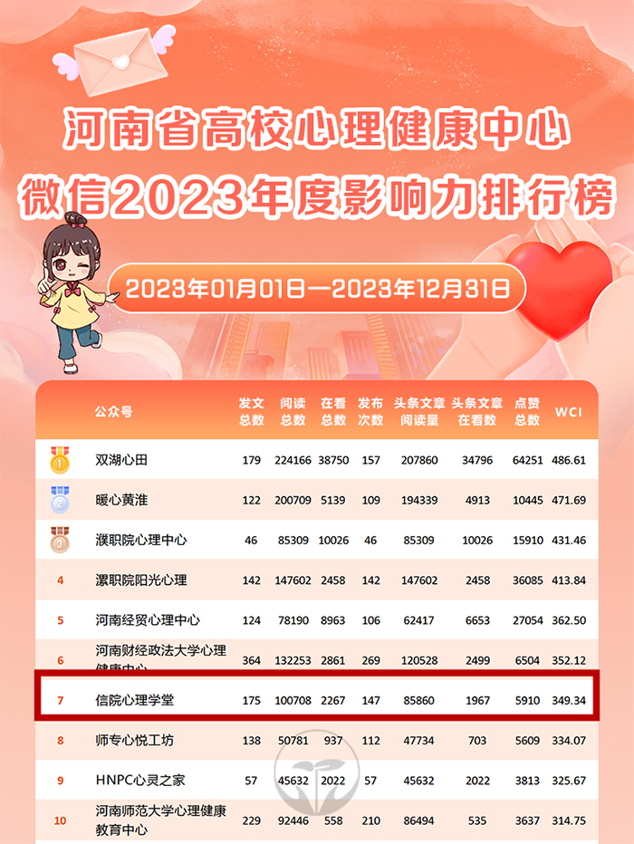日前,省教育厅正式发布《河南省高校网络思政工作(矩阵建设)2023年度新媒体白皮书》(以下简称“白皮书”)。据“白皮书”数据显示,我校“信院心理学堂”微信公众号荣登2023年度河南省高校心理健康中心官方微信排行榜TOP10,位列第七名。