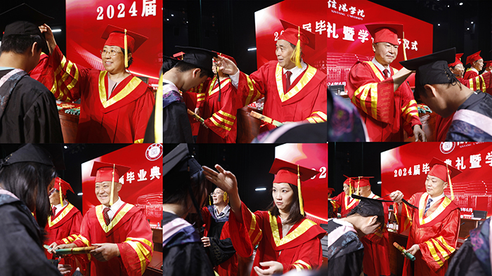 颁奖典礼结束后,高云、王北生等校领导和校学位评定委员会委员共同为2024届毕业生代表授予学位,正冠拨苏。
