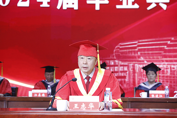 王北生发表热情洋溢的讲话,代表学校向圆满完成学业的2024届毕业生表示最热烈的祝贺,向辛勤养育学子们的父母、悉心教导学子们的老师以及所有帮助学子们成长成才的朋友们致以崇高的敬意和衷心的感谢。