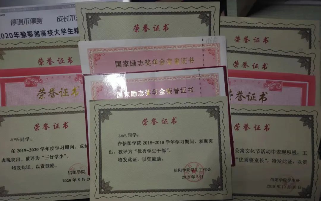 她曾荣获三好学生、优秀学生干部、优秀学生、先进个人等荣誉称号;在豫鄂湘高校大学生经营挑战赛新道约创经营模拟大赛中,荣获团队“三等奖”。