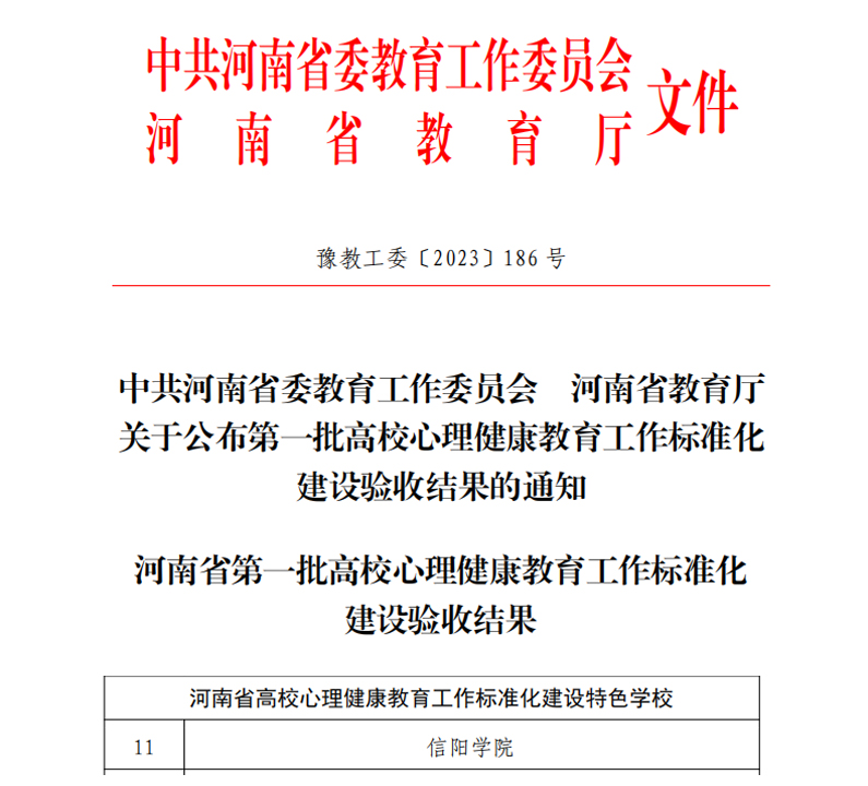 信阳学院一向重视学生心理健康教育工作标准化建设,自2022年3月中共河南省委教育工委、省教育厅下发《关于开展“河南省普通高等学校心理健康教育工作标准化建设(2022-2025)”的通知》(豫教工委【2022】15号)以来,学校逐条对标文件要求,明确建设时间线,不断改善体制机制,加大队伍建设和经费投入;学校心理健康辅导中心、各学院二级心理辅导站建设扎实推进,取得了明显实效。