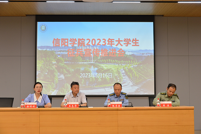 5月16日上午,学校2023年大学生征兵工作推进会暨期末学生工作会议在图书馆101报告厅召开。浉河区人民武装部政委张志勇上校、军事科科长陈浩,我校副校长王志华出席会议。学工部、武装部负责人,各学院党总支书记、学工秘书(干事)、全体辅导员参加了会议。学工部部长余婷婷主持了会议。