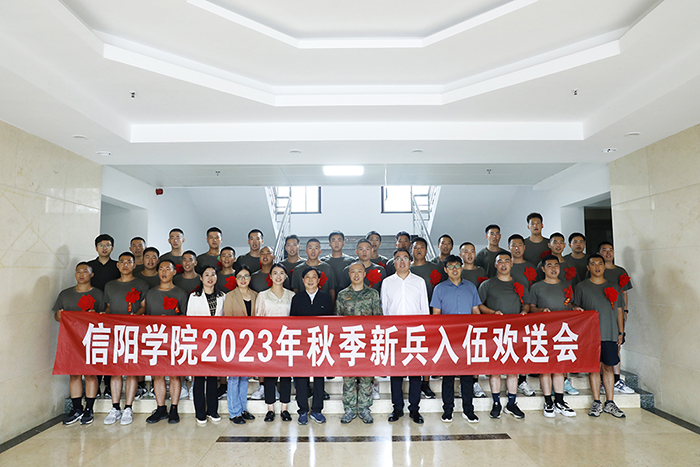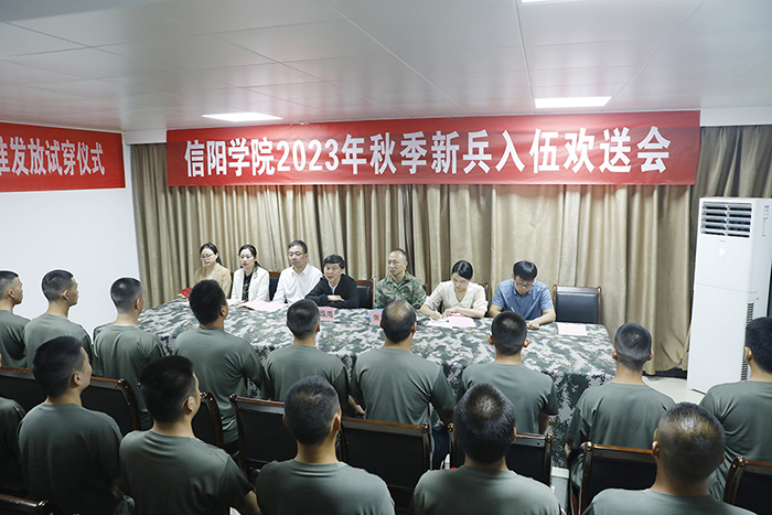 9月12日上午,信阳学院2023年秋季应征入伍学生欢送仪式在浉河区人民武装部新兵集训基地四楼会议室举行。校党委专职副书记施昌海、浉河区人民武装部政委张志勇出席活动。学工部、人民武装部负责人和部分学院党总支书记,即将奔赴军营、献身国防的新兵代表共同参加了此次活动。